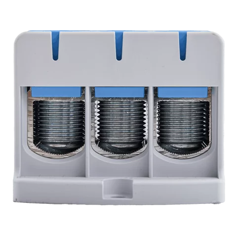 Tracon főáramköri leágazó kapocs, sínre szerelhető vagy csavarozható, kék színben.