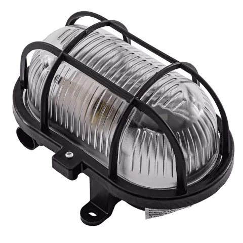 Hajólámpa E27 60W IP54 műanyag házas fekete ovál Rácsos hajólámpa Commel 331-111.