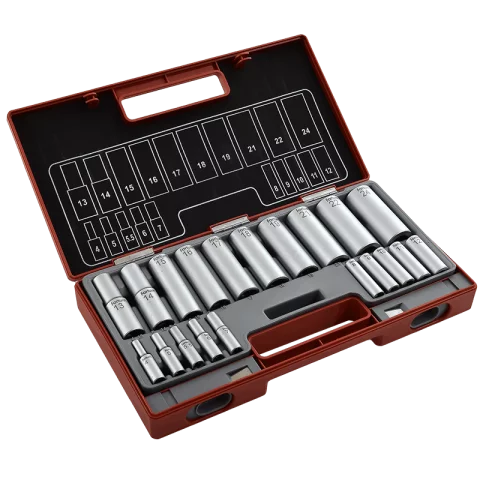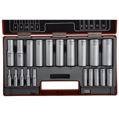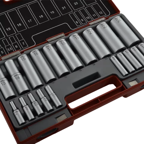 Hosszított dugófej készlet 20 darabos Műanyag kofferben 1/2" 13-24mm - 1/4" 4-12mm 61CrV5 Fortum