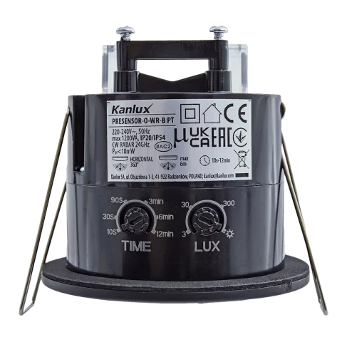 A Kanlux PRESENSOR-O-WR-B PT (38753) a PRESENSOR sorozat teljesen fekete színű, mennyezetbe süllyeszthető mikrohullámú jelenlétérzékelője, amely modern, sötét mennyezetekhez és designos terekhez illik. A 24 GHz-es technológiának köszönhetően nemcsak mozgást, hanem apró elmozdulásokat és jelenlétet is képes érzékelni, így ideális irodákba, tárgyalókba, open office terekbe, mosdókba, öltözőkbe vagy olyan helyiségekbe, ahol az emberek hosszabb ideig, akár kevés mozgással tartózkodnak. A 360°-os érzékelési szög, a max. 6 m-es hatótáv, valamint a fény- és időállítás együtt intelligens, komfortos és energiatakarékos világításvezérlést biztosít.