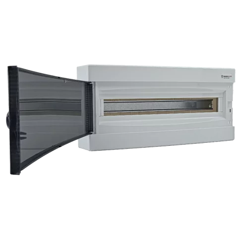 Az átlátszó ajtó lehetővé teszi az elosztó állapotának gyors ellenőrzését az ajtó kinyitása nélkül, miközben esztétikus megjelenést biztosít.A 24 modul befogadására alkalmas, egy soros kivitel ideális megszakítók, áramvédő kapcsolók és egyéb DIN sínre szerelhető készülékek elhelyezésére. Az ABS műanyag ház jó mechanikai szilárdságot és hosszú élettartamot garantál beltéri alkalmazás esetén.