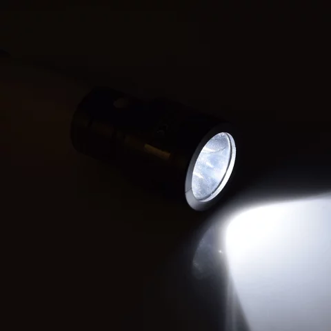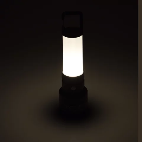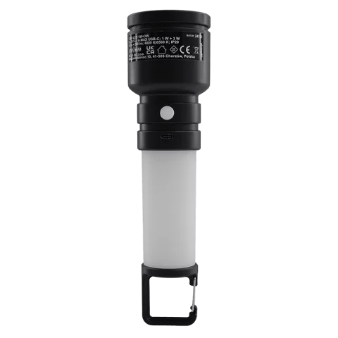 Az elejében lévő 1 W-os LED zseblámpa (kb. 60 lm) fókuszált, szúrófényt biztosít, ami jól használható kereséshez, közlekedéshez vagy precíz munkákhoz. A markolatban található 3 W-os, 360°-ban szórt fényt adó LED (kb. 200 lm) már kisebb teret is bevilágít, így ideális sátor-, munkaterület- vagy segédfénynek. A hátulján lévő akasztóval fel is lógatható, de sík felületre állítva stabil, kis állólámpaként is használható – univerzális megoldás szinte bármilyen helyzetre.