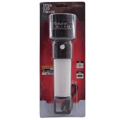 A Strühm STER LED elemlámpa egy sokoldalú, tölthető zseblámpa–lámpás hibrid, amely egyszerre szolgál irányított zseblámpaként és 360°-os területvilágításként. Kompakt mérete ellenére meglepően erős fényt ad, így tökéletes társ kempingezéshez, barkácsoláshoz, áramszünet idejére vagy akár az autóban tartalék fényforrásnak. A beépített akkumulátor USB-C csatlakozón keresztül tölthető, így power bankról, laptopról vagy USB hálózati adapterről is könnyedén életre kelthető.
