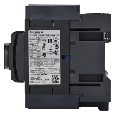 Schneider Electric LC1D65AP7 típusú TS 35-ös kalapsínre pattintható mágneskapcsoló-kontaktor, 3 záró (NO) főérintkezővel +1 nyitó (NC) segédérintkezővel, 65A-es terhelhetőséggel.