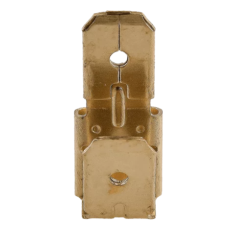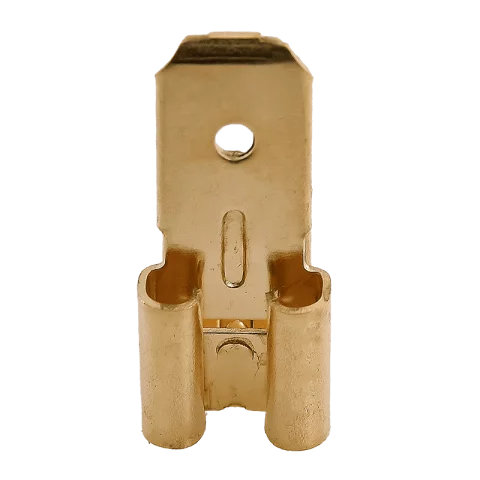 Szigeteletlen rátolható csatlakozó hüvely (anya) + csatlakozó csap (apa) egyben, bontható lapos kötésekhez jármű-, háztartási és elektronikai alkalmazásokban. Anyaga sárgaréz. A csatlakozó hüvelyként és csapként is alkalmazható, mindig azonos méretű párt kell választani (jelen esetben 6,3x0,8 mm), hogy a kapcsolat feszes és üzembiztos legyen.