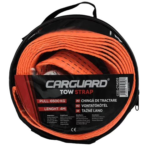 Vontatókötél 4m Fém karabínerekkel 6500kg hordtáskában 50mm széles PE műanyag kötél Carguard.